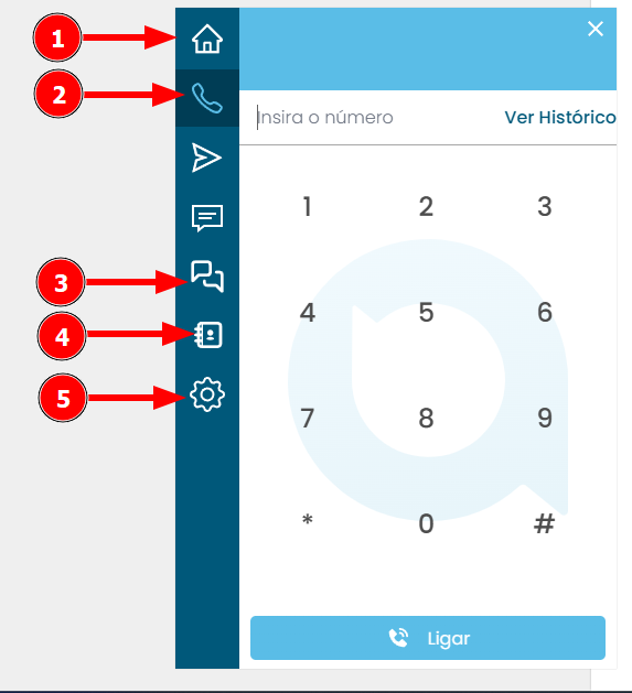 Com o softphone aberto, seu atendente terá a opção de visualizar o histórico de chamadas (1), acessar o discador (2), conversar com os demais agentes através do chat interno (3), ver os contatos tanto internos quanto de clientes (4) e alterar configurações relacionadas ao tema e som do softphone (5), conforme indicado abaixo:
