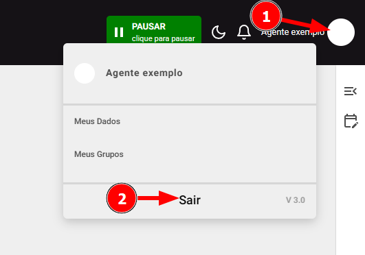 Ao finalizar as atividades, seu agente conseguirá desconectar da plataforma clicando no ícone ao lado de seu nome (1) e clicando em "Sair" (2).